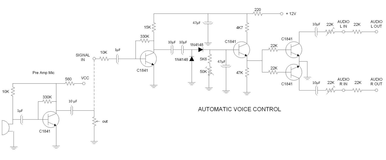 Rangkaian sederhana ini pernah saya gunakan pada FM Transmitter, fungsi rangkaian ini untuk mengeliminasi suara backsound apabila ada input suara dari si penyiar radio, suara musik akan mengecil apa bila ada masukan signal dari pre amp mic. Rangkaian ini dapat dimodifikasi dengan mengganti 2 buah transistor yang terakhir menggunakan IC 4066, PCB rangkaian seperti ini juga pernah saya lihat di toko elektronik, tetapi pada skema tersebut menggunakan beberapa IC, tetapi prinsip kerjanya sama, yaitu untuk menutup suara musik apabila ada suara vocal penyiar.