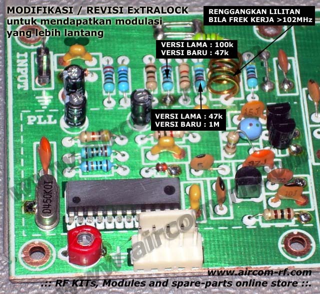 Dari uji coba kami dan beberapa laporan yang kami terima dari pengguna produk AIRCOM ternyata cara A. menyebabkan ExTRALOCK tidak bisa lock di frekuensi >102MHz. Solusinya gunakan Cara B. Sejak Nov 2009 nilai standar dari ExTRALOCK menggunakan nilai komponen yang tertera pada gambar di samping.
