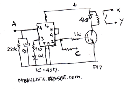 jantung rangkaian menggunakan 4017 yg difungsikan sebagai flip-flop (tekan sekali hidup tekan sekali lagi mati)
