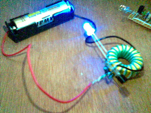 saya buat dengan transistor c 2222 dan resistor 1 k, lilitan 6 putaran , bisa menyalakan 30 lampu led , dengan 2 buah batrey yang sudah tidak mampu menggerakkan jarum jam, dan mampu meyalakan 30 lampu led selama 12 jam sehingga sangat bagus buat alternatif . ide1 ide1