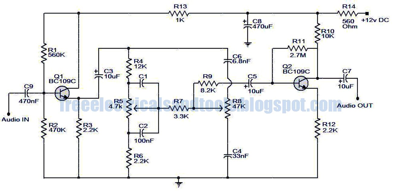 cuma pake 3 tr didepan ada penguat lagi untuk mik kondenser .... hm ... yang diperlukan si nilai2 c dan r nya di tone ... kalo di tone kan mungkin sama2 aja perinsipna ... demikian sekilas info kang ....